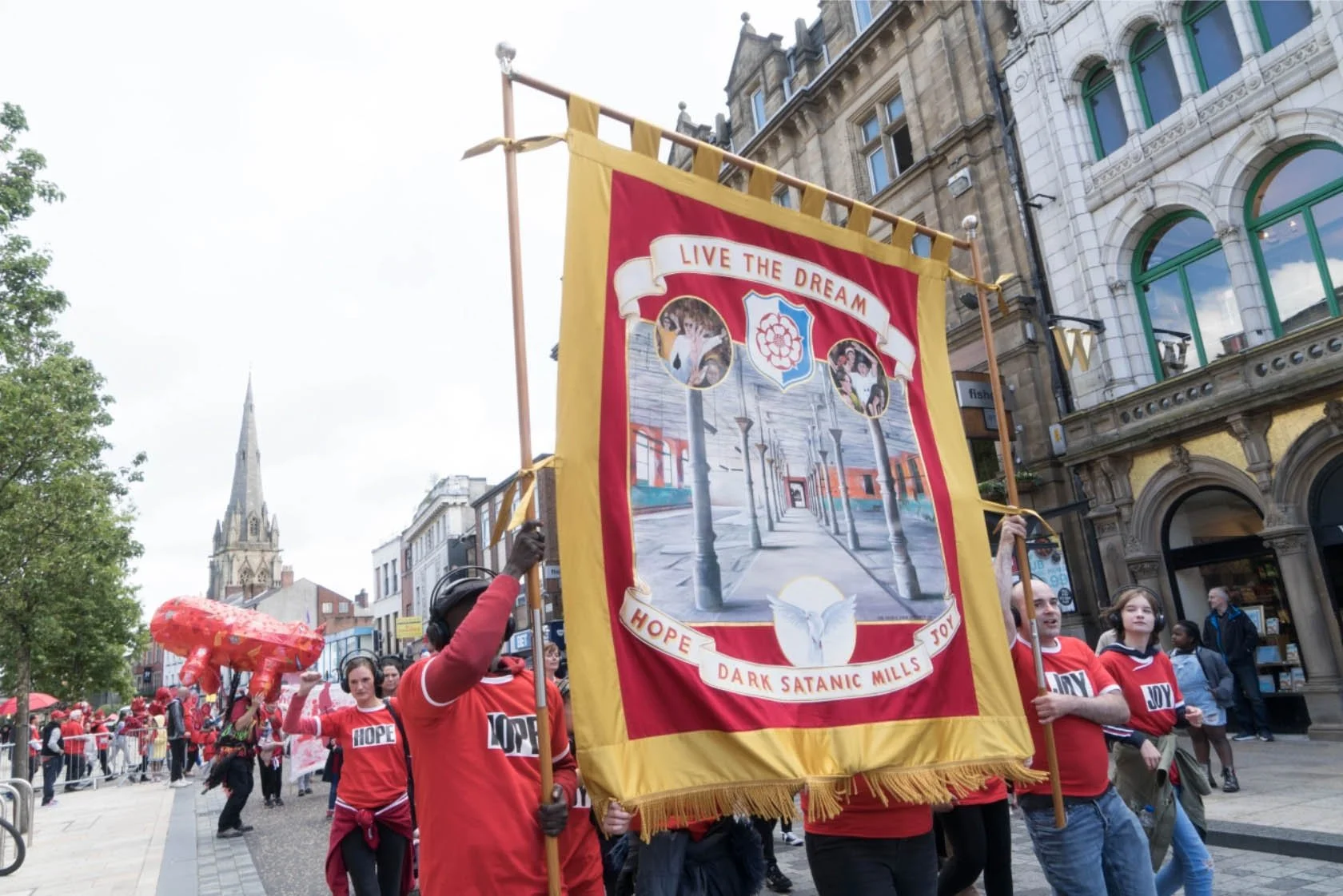 In Thatcherite Britain, as mills and mines were closed; out of an air thick with a political, smog and a lack of hope, emerged evenings of euphoric, ecstatic revellery. Repetitive electronic music replaced the endless clicks and clacks of the mills machinery. Once the home to industrious and lucrative producers and the busy hands of mill workers; these vast empty spaces were filled with thousands of young people gathering to dance. Ecstasy brought rivals together, and a cat and mouse game with Blackburn’s police, bonded Ravers together as they stepped into a new consciousness in mass unions. Archetypal objects of commemoration, and the detritus of abandoned industry, are used in Holman’s work, as stained glass, silk banners, white label vinyl records, industrial signs, lights and windows; all preserve the stories of Acid House and the Summer of Love, and continue the unexpected stories of poets, painters and filmmakers who came before.