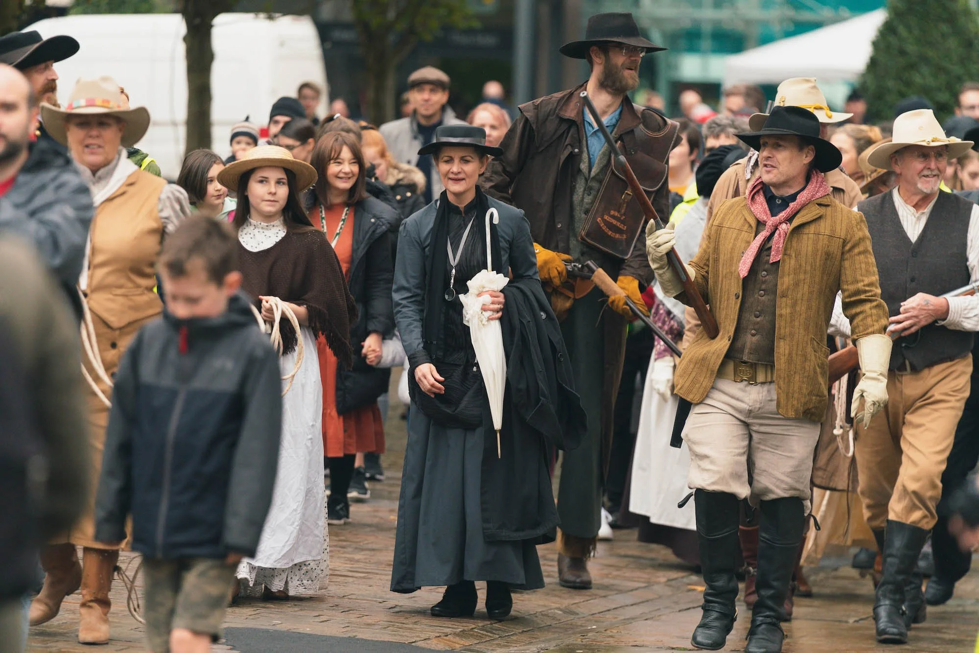 Across these two different lands an inextricable link exists. From the cotton grown on the backs of slave labour in American soils, to its transportation to be woven by Lancashire’s working classes. Blackburn’s mill workers, weavers and unionists stood in solidarity of their foreign counterparts. Grimshaw was outvoted 12 to 3088 and riots began across the North as weavers supported the abolition of slavery igniting a transformation across America, led by Abraham Lincoln. Tales of Confederate Cowboys spreads through the mill towns and in to the ears of two young boys who will grow up to be the first filmmakers in Northern Britain. Mitchell and Kenyon reside in the sooty hills of industrial Blackburn recording life’s daily grind with the first moving picture cameras. And then one day, in the fields they transform local mill workers into cowboys and Native American as they act out ‘The World’s First Western’.